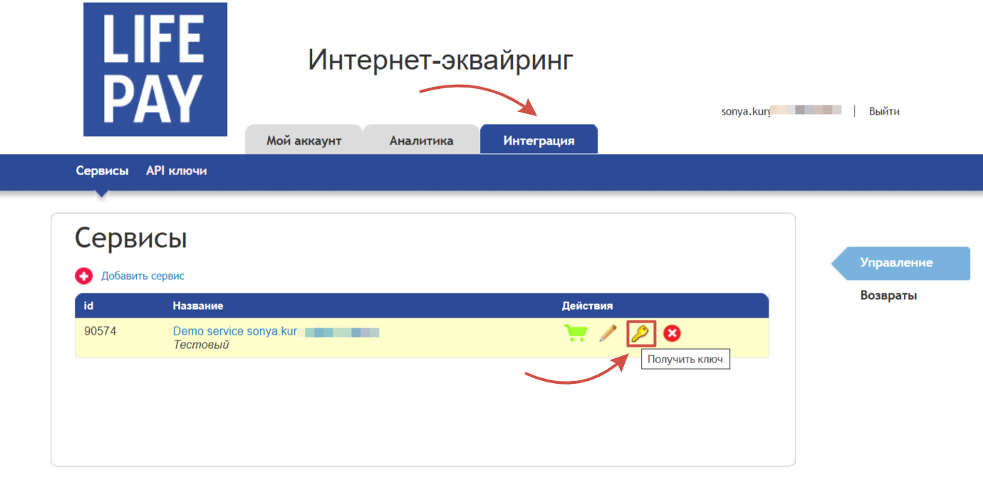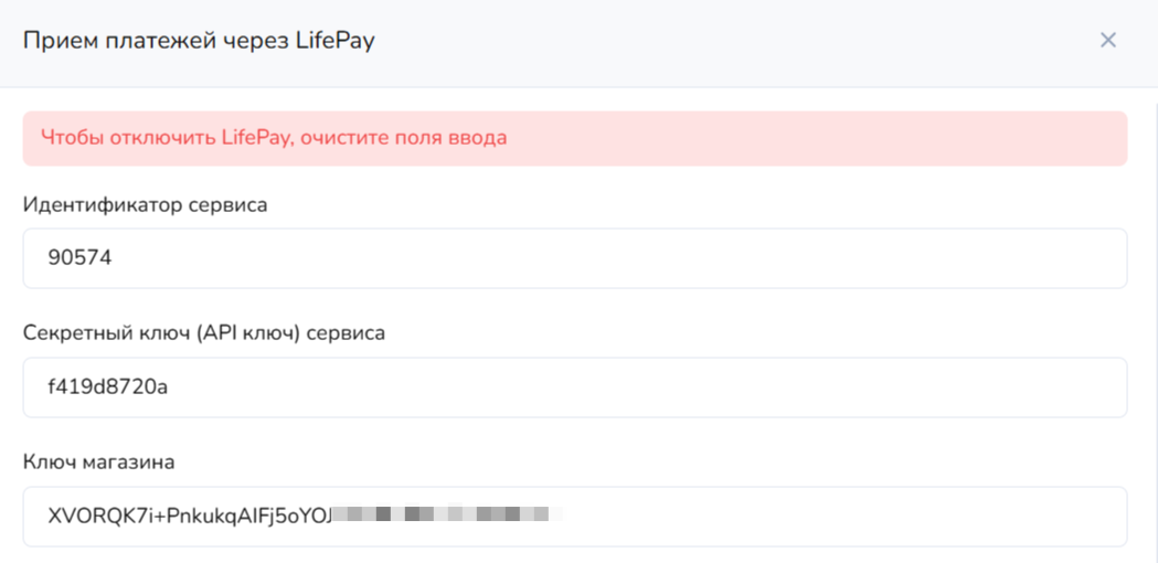 Для подключения платежей через Life Pay нужно перейти на сайте [home.life-pay.ru](https://home.life-pay.ru/) в личный кабинет, во вкладку "Интеграция" → "Сервисы" и нажать на иконку ключа подключаемого сервиса