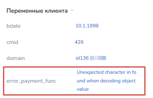 Если ссылка на оплату не сформируется или каким-либо образом не получится ее создать, то причина будет отображена в переменной в карточке клиента: