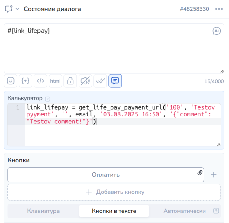 <figure><img src="https://4216716816-files.gitbook.io/~/files/v0/b/gitbook-x-prod.appspot.com/o/spaces%2F-LxKl4rC_EcwBAz40Qn_%2Fuploads%2Fbwsya5ad3FdoK3HylC7A%2Fimage.png?alt=media&#x26;token=4e95be4b-72ec-42fb-8d77-3f1cc9671e7c" alt="" width="563"><figcaption><p>Функция указана в калькуляторе, ссылка для оплаты будет выведена в тексте сообщения клиенту</p></figcaption></figure>