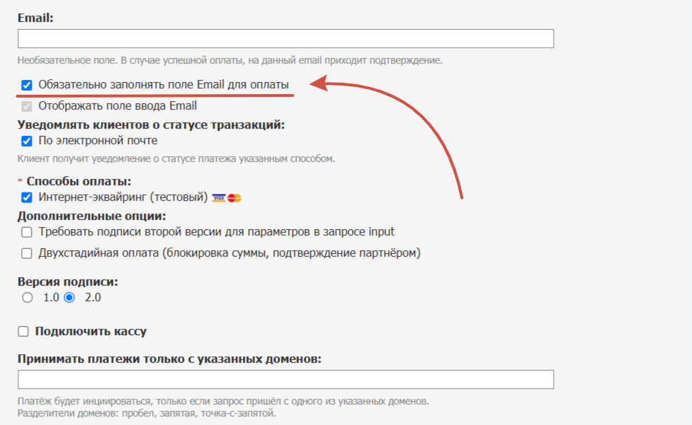 Если планируется использовать платежную систему для оплаты в курсах, то нужно включить пункт в настройках магазина  "Обязательно заполнять поле Email для оплаты". Пример включенного окна в скриншоте ниже.&#x20;