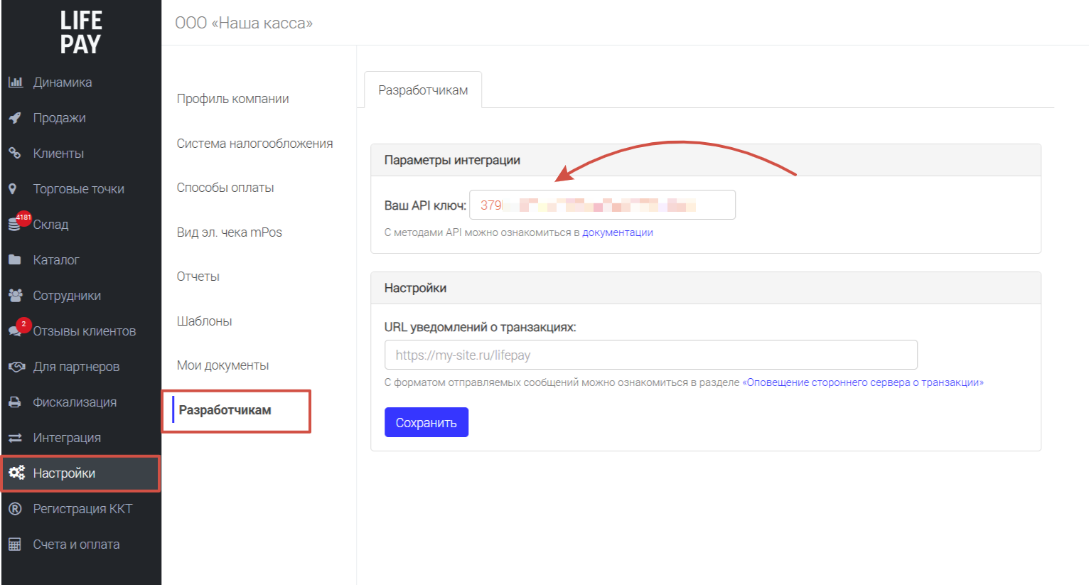 Далее перейдите в Настройки → раздел "Разработчикам", где вам необходимо найти ключ API для интеграции: