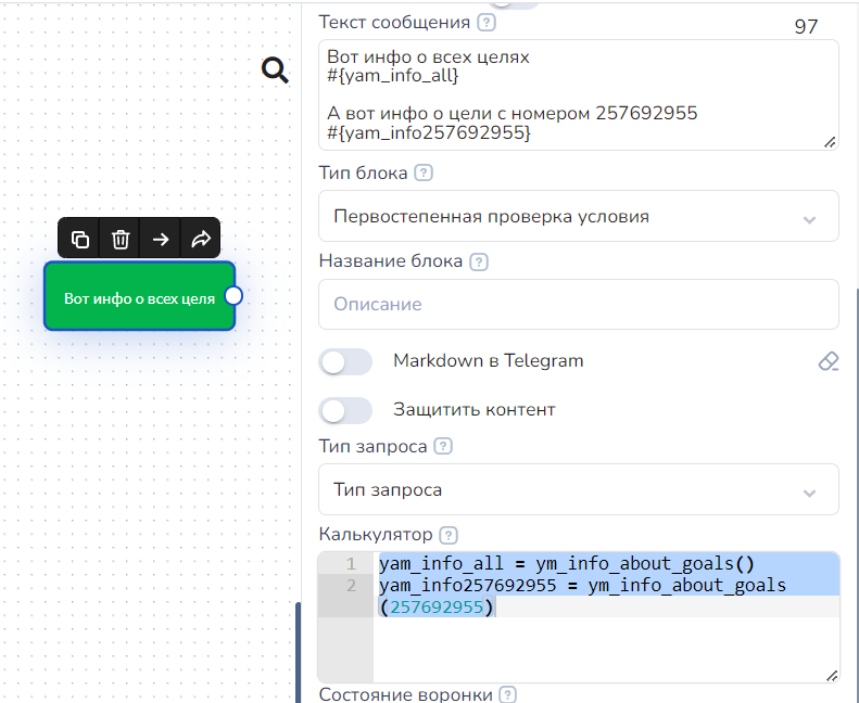 Дополнительно. Вывод информации обо всех целях в Salebot Если Вы запамятовали данные о своих целях в Яндекс Метрике и хотите вывести их все в переменную в Salebot, воспользуйтесь функцией ym_info_about_goals(ym_goal_id, oauth_token, counter_id), где