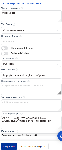 Теперь вернемся в Salebot. Продолжим редактировать наш блок с промокодом. Тип запроса. POST-json URL запроса. https://store.salebot.pro/function/gsheets JSON POST-параметров. {"id": "1sl15vKFjo5TFD98GnVjF3AlLtdhr85-AkEjoeJkgDxE", "mapping":{"a":"#{Промокод}"}} Где вместо 1sl15vKFjo5TFD98GnVjF3AlLtdhr85-AkEjoeJkgDxE вставите id, полученный выше из адреса вашей таблицы.